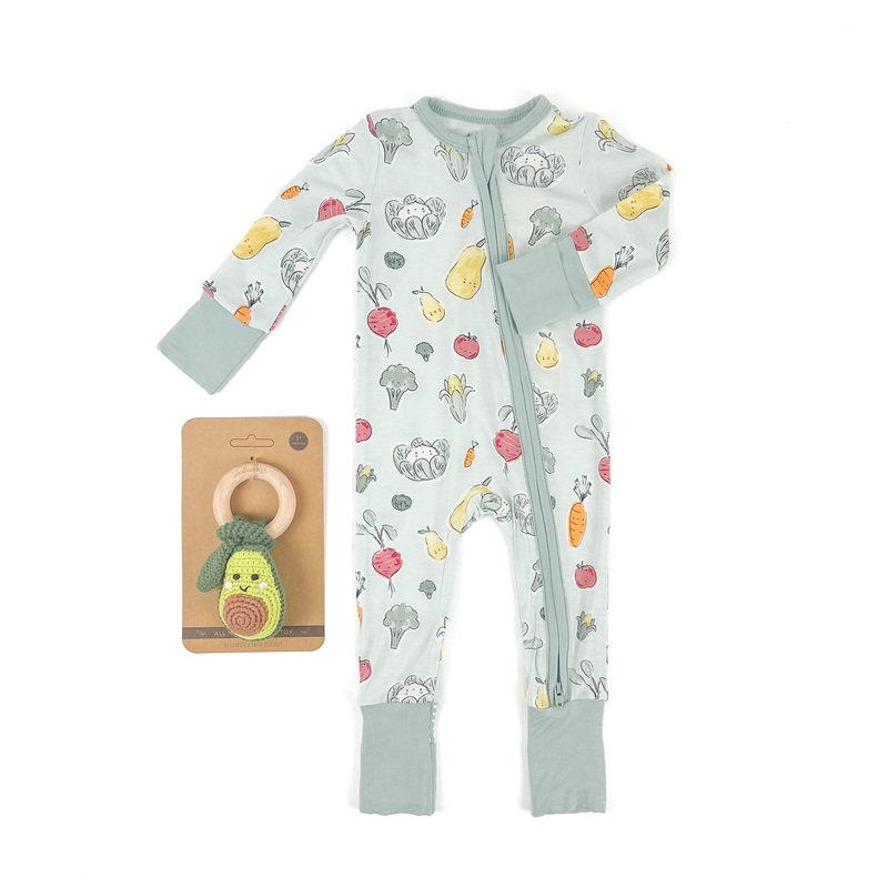 Materials: 95% viscose from bamboo, 5% spandex.Care: machine wash gentle cycle, tumble dry low. (Avocado rattle not included)