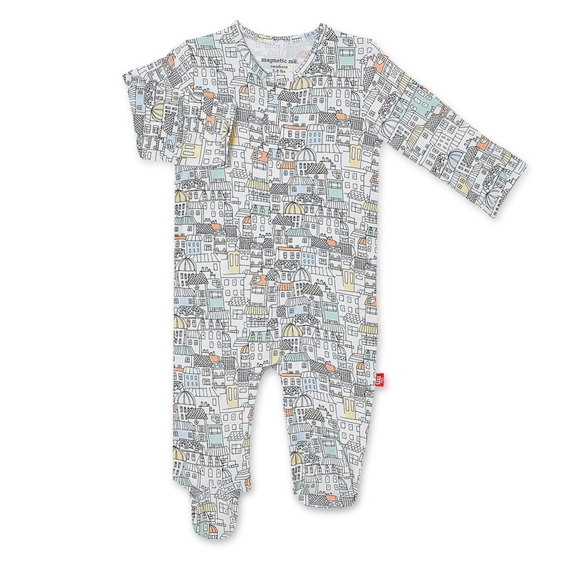 The we built this city modal magnetic footieisa soft, stylish all-day and all-night wardrobe staple with smart magnetic fasteners that makes changing time painless. With our no over-the-head design, simply open the outfit, insert baby, and BOOM, DONE! – the footie practically closes itself. Machine wash as directed.