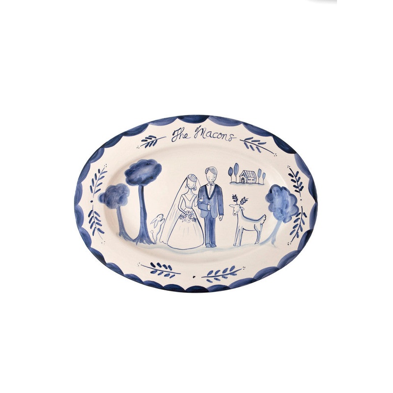 Self-taught artist Tricia Lowenfield crafts one-of-a-kind whimsical pieces that will become family treasures in time. This made-to-order custom Wedding Platter features a delicate drawing of the happy couple to memorialize their day. Personalize it with th