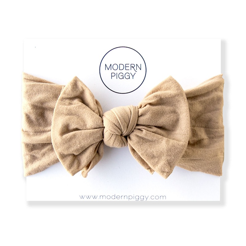 Our baby bands are a wrap style bow made out of high quality nylon.Each bow measures approximately 4.5" x 3 on a stretchy nylon band that fits newborn to toddler.We look forward to seeing your sweet babe wearing #modernpiggy.**Our bows may contain small pa