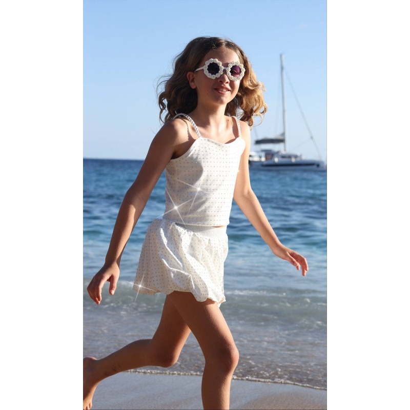 - Glamorous two-piece set featuring a dazzling crystal-studded crop top and a unique bubble-style skirt.