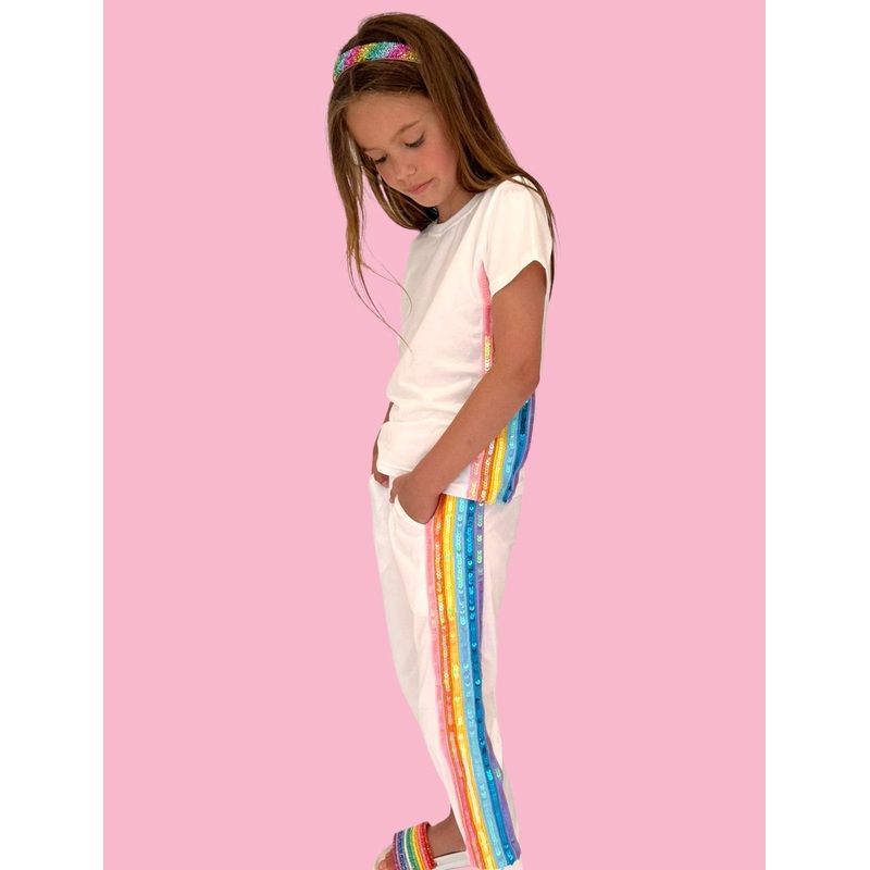 - Stylish white jogger set featuring vibrant rainbow sequin stripes down the sides.