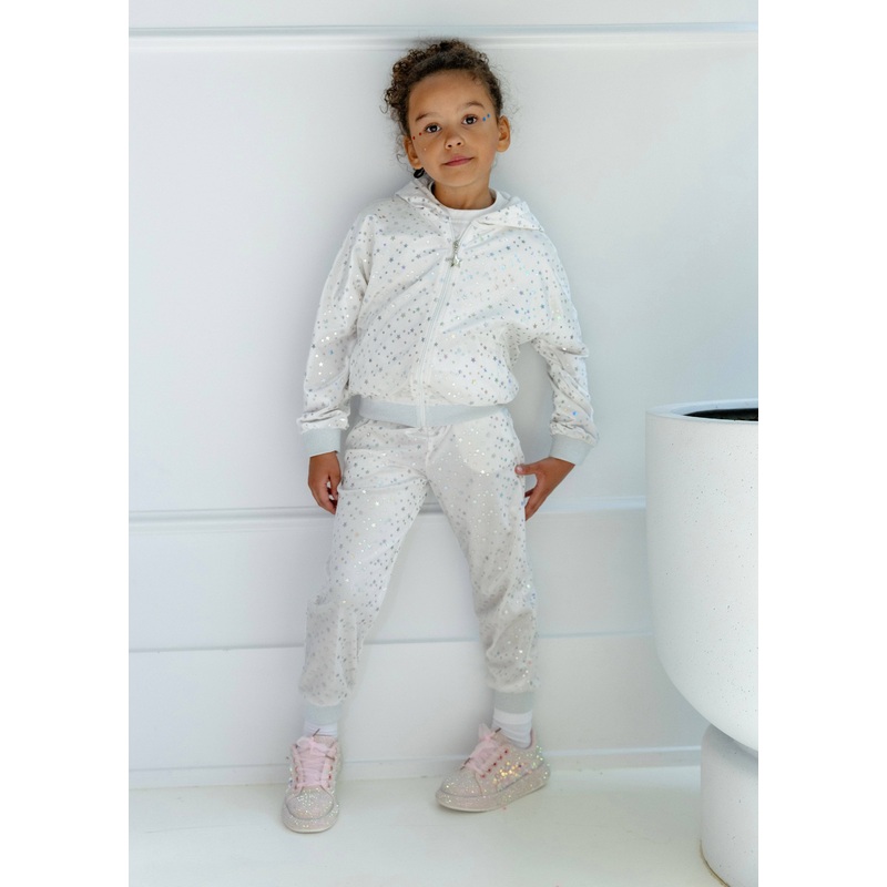 Description:Shine bright with this joggers set in vibrant white, adorned with silver star prints for a dazzling look thats perfect for any outing.This set includes a zip-up hoodie and matching joggers, combining comfort and style with ribbed cuffs for a sn