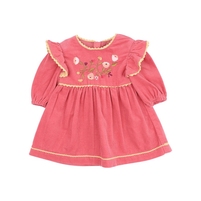 This sweet fuchsia pink cord long sleeve dress is perfect for any outing, featuring a beautiful front embroidered bodice and lace trimming this dress is a must have in your little one's Winter wardrobe. Pair it back with our tights for a complete outfit. F