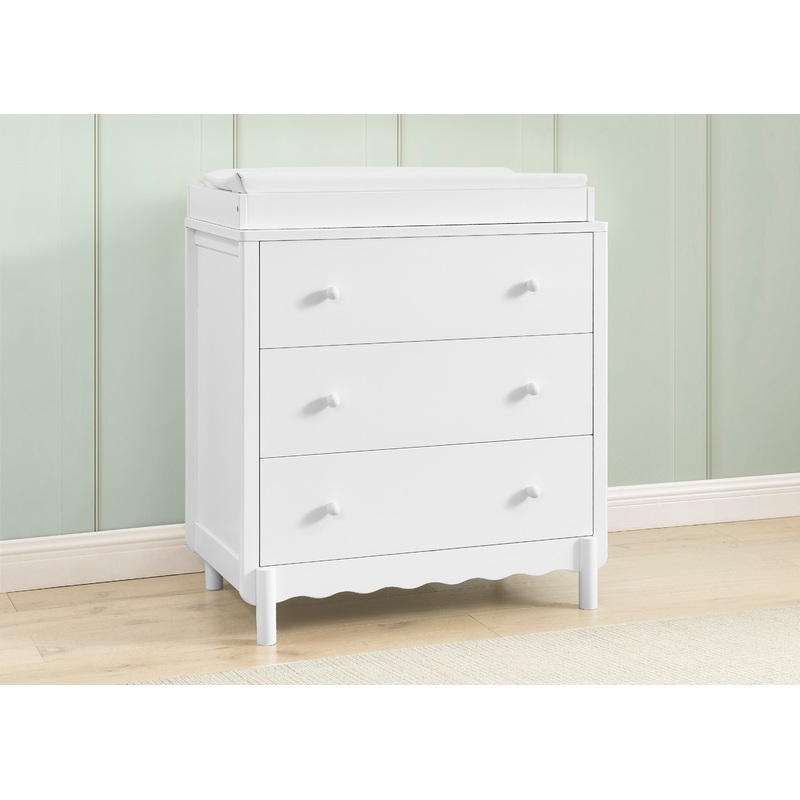 The William 3 Drawer Dresser with Changing Top by Delta Children adds a touch of playfulness to any space with its charming scallop detailing paired with round feet and knobs. This spacious storage piece serves as a sturdy changing table too, with the incl