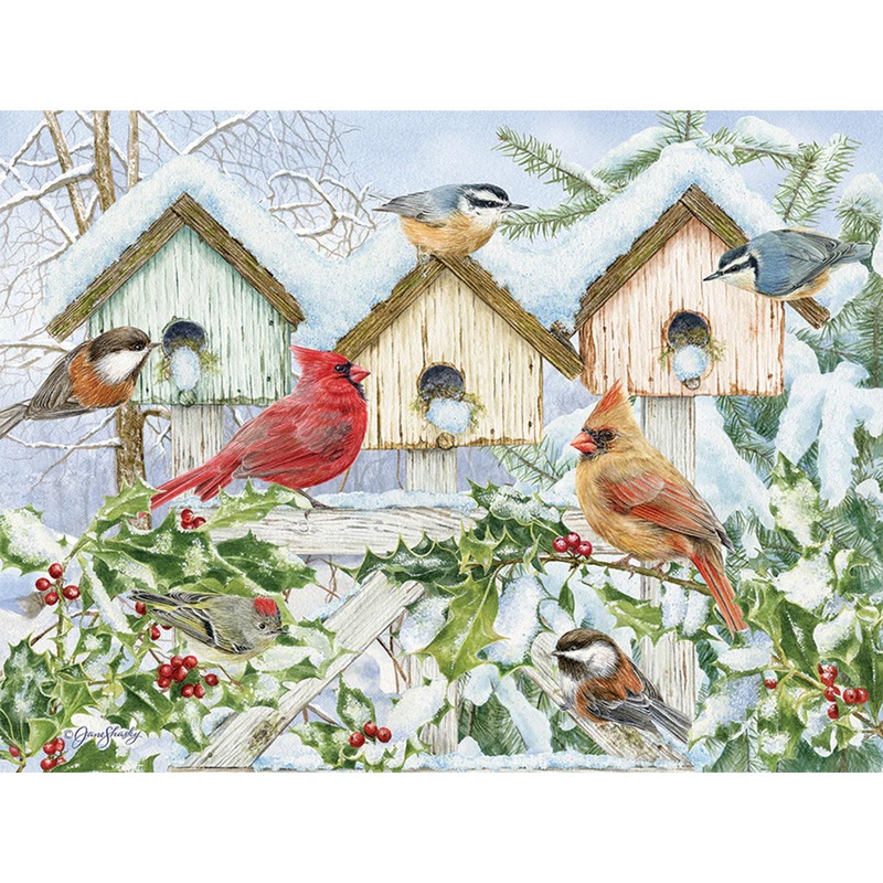 An assortment of cardinals and chickadees gather around a series of birdhouses accented by lively holly leaves. A layer of snow drapes the roofs in this beautiful and easy to put together puzzle with extra large pieces. 275 PiecesAssembled Size: 26.625" x