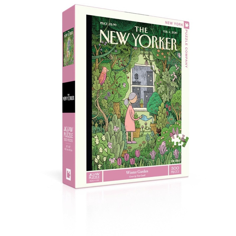 Step into a serene and cozy world with Winter Garden, a 500 piece jigsaw puzzle featuring the captivating 2019 New Yorker magazine cover art by Tom Gauld. This enchanting scene showcases a woman tending to her indoor oasis, surrounded by a lush array of vibrant greenery as rain gently pours outside the windows. The contrast between the peaceful indoor garden and the moody weather creates a calming and immersive puzzle experience. With intricate details and soft, soothing colors, Winter Garden invites puzzle lovers and art enthusiasts alike to escape into a tranquil, green-filled sanctuary. Perfect for cozy afternoons or relaxing evenings, this puzzle celebrates the beauty of nature indoors and the peaceful moments of solitude.