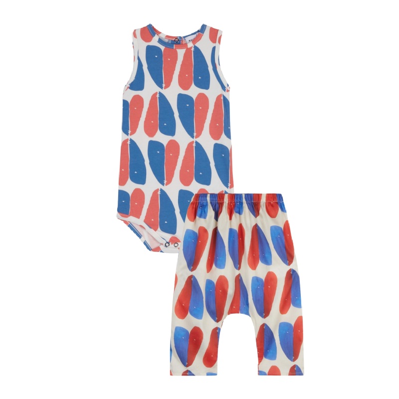 wolf & ritaruben +nelson set in coracao. sleeveless bodysuit with snap buttons between the legs and on the back.