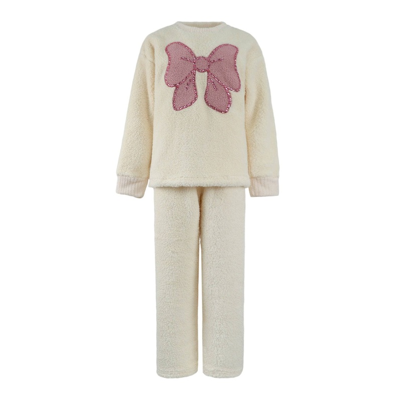 Description:This chic two-piece set features a fleece design with a dazzling pink crystal bow detail for a stylish touch.Includes a relaxed-fit top with cuffed sleeves and matching straight-leg pants for effortless comfort and elegance.Perfect for staying