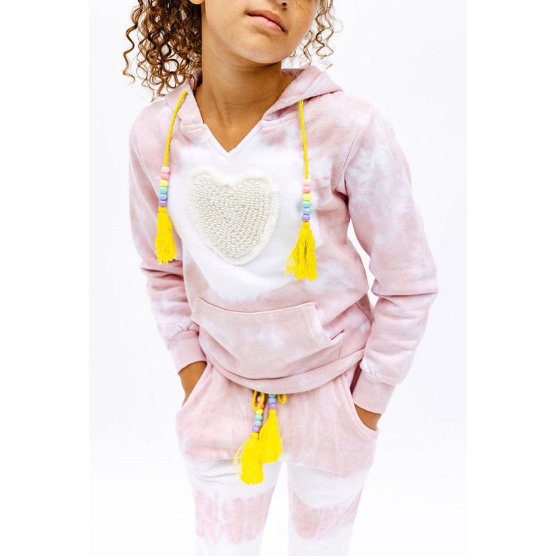 - Stylish two-piece set featuring a soft pink and white tie-dye design, accented with a sequin heart patch for a playful touch.