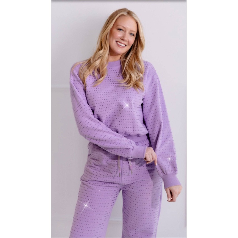 Description:A chic and sparkling lavender set adorned with delicate crystal detailing for an effortlessly stylish look.Features a relaxed top with wide sleeves and matching drawstring pants, ensuring both comfort and elegance.Perfect for casual moments or