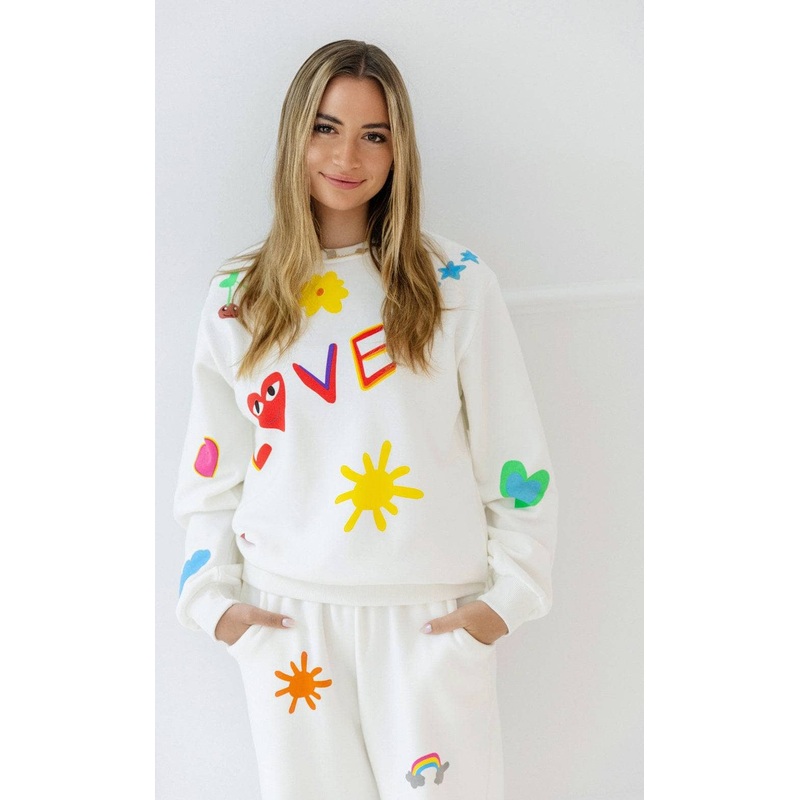 - Fun and playful two-piece set featuring a sweatshirt and matching joggers adorned with vibrant love doodles.