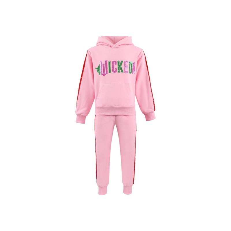 Description:Trendy pink hoodie and jogger set featuring bold sequin stripes down the sleeves and pants for a fun, eye-catching look.The hoodie showcases a colorful "Wicked" graphic on the front, adding a pop of sparkle and personality to this stylish set.T
