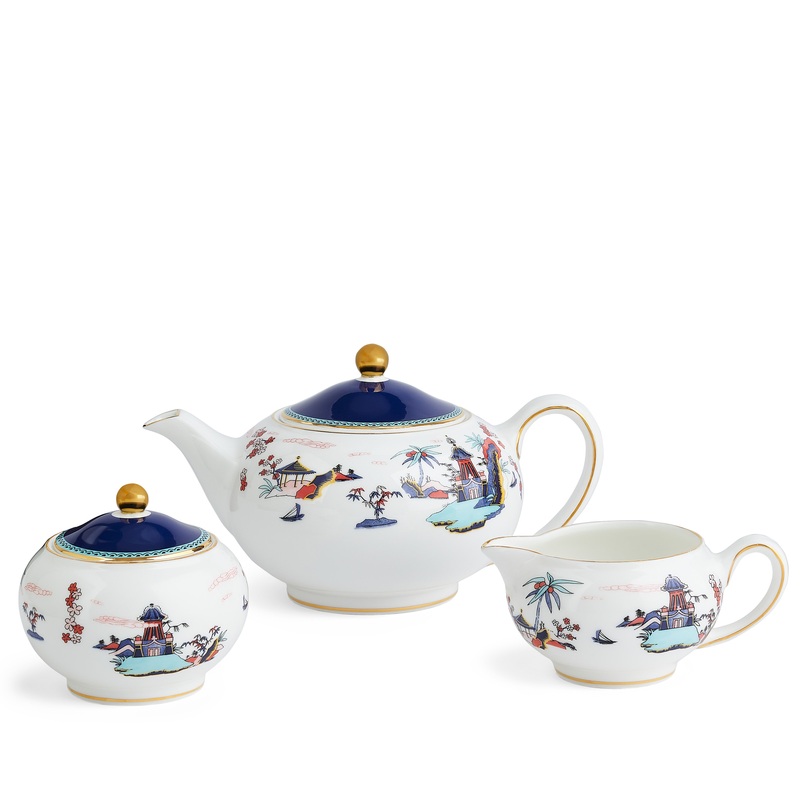 For over 260 years, Wedgwood has produced timeless, eclectic stoneware and china that has graced the tabletops of kings, queens, and some of the finest dining rooms in the world. From its factory inBarlaston, England, the brands signature dishware and household items are thrown, modeled and decorated by artisans who spend a lifetime mastering their craft. The Wonderlust collection is an eclectic assortment of tableware and drinkware that pays homage to far-flung destinations all over the world through whimsical illustrated patterns.The Wonderlust 3-Piece Tea Set in Blue Pagoda has everything you need for a transporting tea service, including teapot, sugar bowl and creamer.