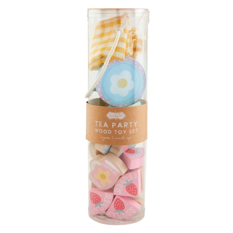 The Wood Tea Party Toy Set is a 17-piece set crafted from high-quality pine wood. It features a delightful wooden tea pot, six delectable treats, two cups, two spoons, two plates, a creamer, sugar, a table cloth, and a cake stand. Ideal for children aged 3 and above, this toy set offers endless hours of imaginative play. The set’s natural wood finish adds an elegant touch, making it a perfect addition to any playroom or nursery. With its sturdy construction and meticulous attention to detail, this tea party toy set is guaranteed to bring joy and foster creativity in young children.