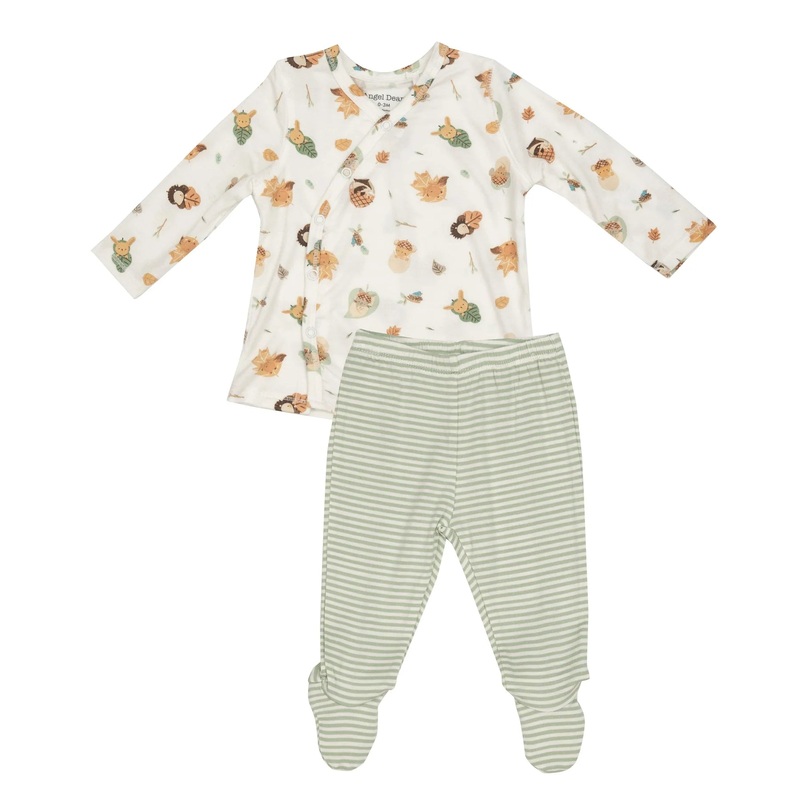 This little outfit by Angel Dear, one of our go-to baby and gift brands, is made of 95% bamboo-derived viscose + 5% spandex, making it super soft and stretchy. We love the side-snap kimono style top, which is wonderful for new babies so you dont have to pull a shirt off over their head. The footed pants are also not to be overlooked, as theyll keep babys feet warm (and socks just dont stay on, trust us).