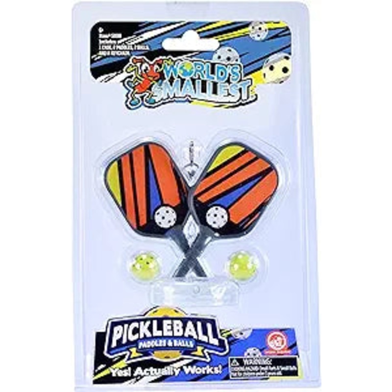 World's Smallest Pickle BallPickleball has become the fastest growing sport in America! Now fans can play the worlds smallest Pickleball!Comes complete with 1 case, 2 paddles, 2 balls and a keychainAll pieces fit inside the pocket-sized, keychain case, mak