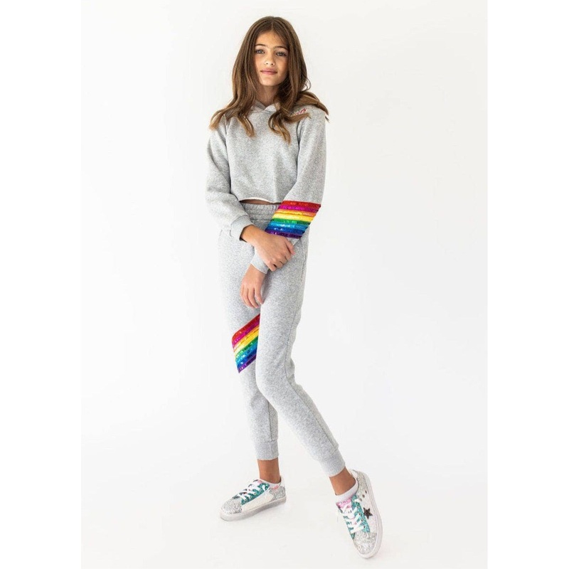 - Stylish two-piece jogger set featuring vibrant rainbow sequin accents on the sleeve and pant leg for a dazzling look.