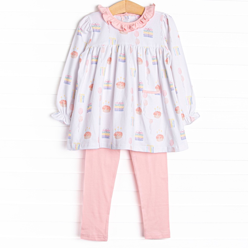 You’re Invited! This set features a top in a festive party print and a pink ruffle collar. Coordinating pink knit leggings to match. This set is too cute!