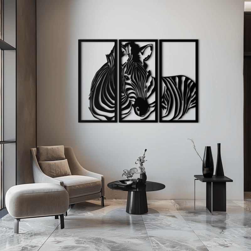 Bring the beauty of the wild into your space with this Zebra Panel Metal Wall Art, a three-piece artwork crafted from 1.5 millimeter premium steel and electrostatically painted for a durable, rust-resistant finish. This stunning zebra silhouette design is perfect for those who appreciate modern metal wall decor, wildlife-inspired artwork, or large steel wall sculptures.