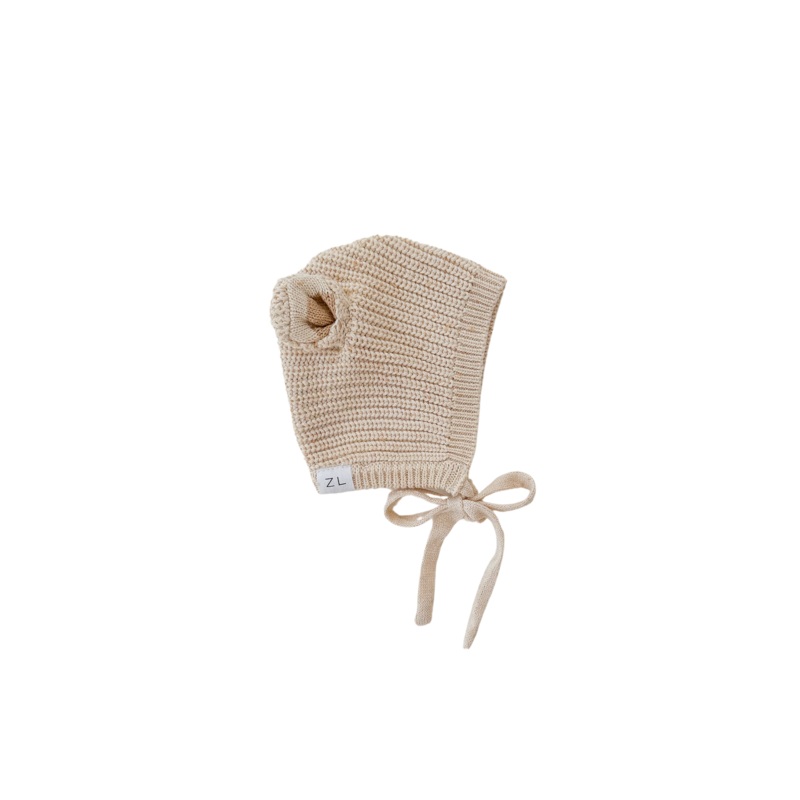 By Ziggy LouBeautiful chunky knit bonnet withadorable bear ears featuring a maple coloured inner ear.Match with our Biscotti Fleck Signature Collection.Size|||TTS, with adjustable ties.Safety|||Never leave baby unattended withbonneton.Removebonnetbefore sl