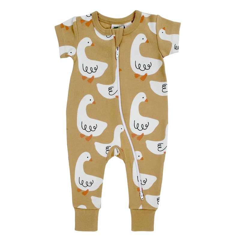 This short-sleeved organic cotton babies’ romper from Parade Organics is designed for ultimate comfort. ‘2-way’ double zippers allow you to zip these pajamas down from the top for dressing and zip up from the bottom for changes, without exposing babies’ tummy or pulling over the head. In a unisex all-over goose print, features also include inner zipper fabric backing and neck fold to protect baby’s gentle skin. The fitted style has ankle cuffs that can be rolled up and down to adjust as baby grows.