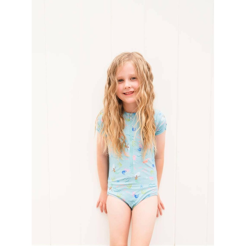 Our one piece short sleeve swim style with front zipper and cinched shoulder detail! Features a UPF 50 protected fabric with beige lining in a bright and summery mermaid print.Printed in our Ollie Jay Exclusive all over print, Mermaid, by Betsy PetersenPai
